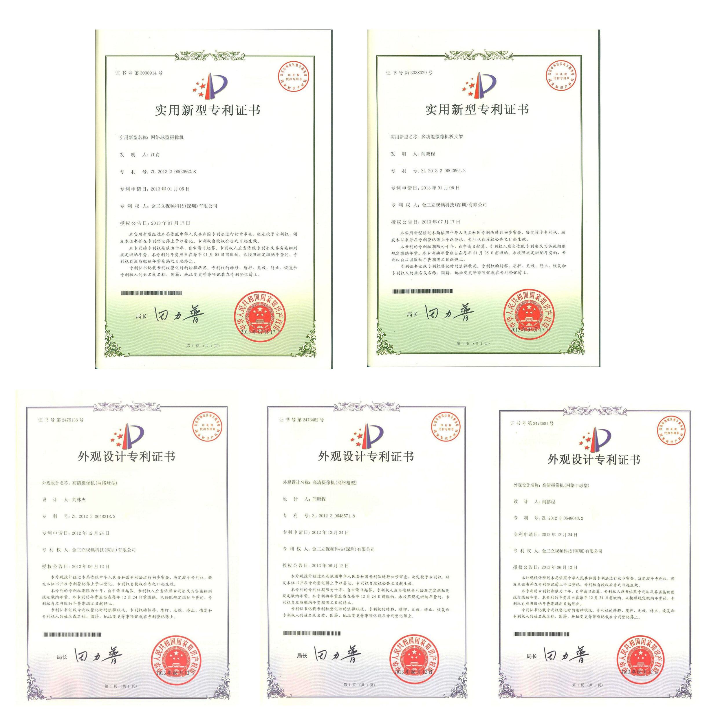 近日,金三立自主研發的“網絡球型攝像機”、“多功能攝像機板支架”獲得國家知識產權局頒發的實用新型專利證書,高清攝像機(網絡球型)、高清攝像機(網絡槍型)、高清攝像機(網絡半球型)獲得國家知識產權局頒發的外觀設計專利證書。