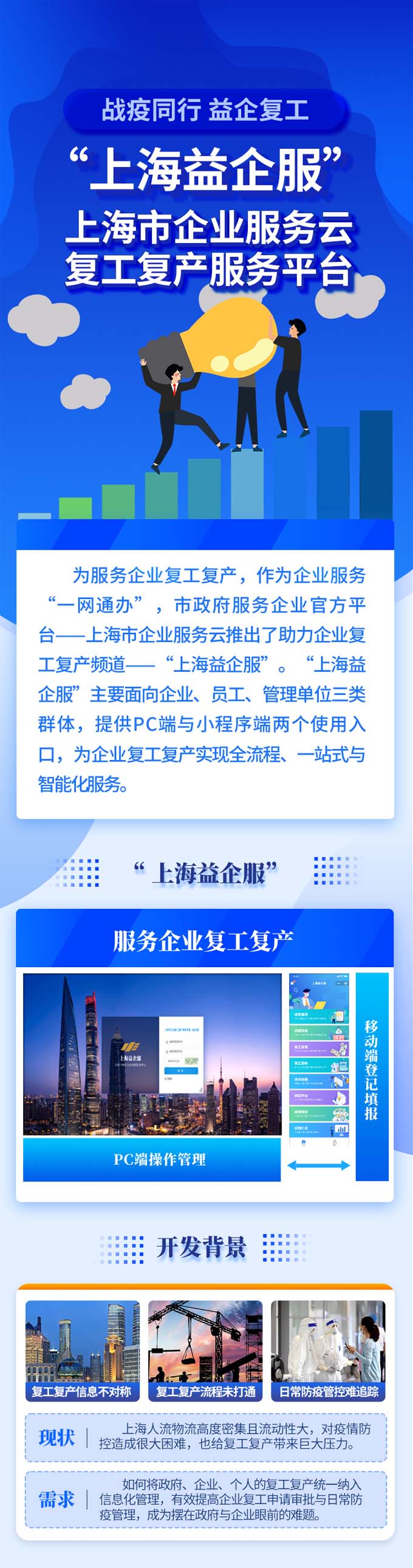為統籌疫情防控和經濟社會發展,近日,上海市企業復工復產服務專窗(上海益企服)上線,助力各區和企業高效便捷推進復工復產工作。“上海益企服”主要面向企業、員工、管理單位三類群體,提供PC端與小程序端兩個使用入口,設有政策查詢、防疫指導、復工自查、復工意向、反饋匯總、供需對接、訴求協調等功能,為企業復工復產實現全流程、一站式與智能化服務。詳見↓